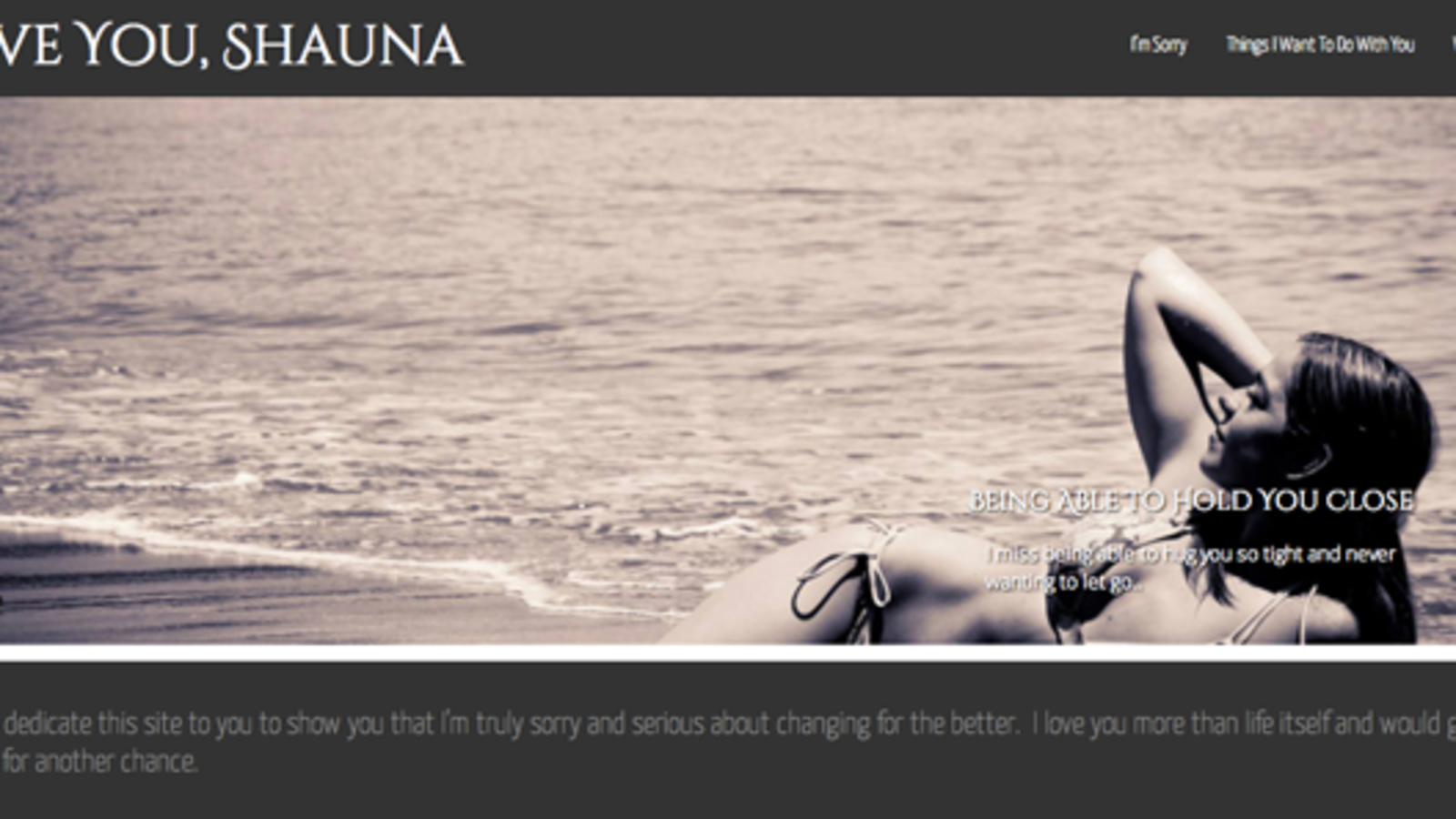 I Love You, Shauna is one man's groveling attempt to win back his beloved Shauna (who is likely mortified) with some HTML magic. We don't know the identity of the guy who made this site, but we'll call him Sad Sack Sam. Why Shauna and Sam split up isn't totally clear, though he says he made "two bad decisions." (According to a tipster, Shauna wanted to move in and get married but Sad Sack Sam wasn't on board, so she dumped his ass. We can't confirm that story, but it doesn't sound out of the realm of possibility.)