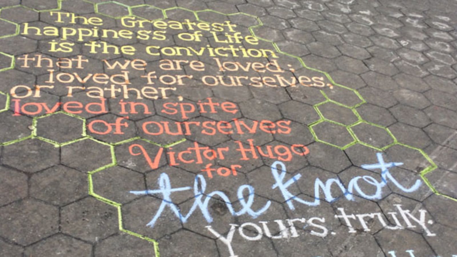 Spotted today in Washington Square Park: Evidence of The Knot's New York street campaign, featuring sweet quotes meticulously presented with adorable fonts in Pantone-approved colors. Never mind that this particular piece of marketing is located where there are likely few people planning weddings—let's talk about who, exactly, the wedding juggernaut has decided to quote.
