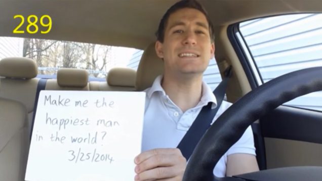 Dean assembled the 365 clips into a giant "countdown" video. Time for the big reveal! While celebrating Jennifer's birthday with her family in Aruba, Dean was ready for his beloved to see just how lucky she was to have him. Jennifer's family led her down to the beach (via whiteboard messages, because Dean understands the importance of thematic consistency) and made her watch Dean's masterpiece, which clocks in at THIRTEEN MINUTES. As the video ended, Jen stood up, turned around, and saw Dean with his stinking whiteboard. There, in front of an audience (of course, always an audience) consisting not just of her family but dozens of random beach gawkers, he got down on one knee and she said yes.